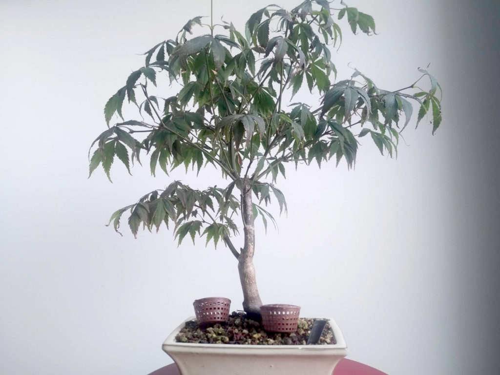 Absent une quinzaine de jours, j’avais mis l’arbre à l’ombre sur une étagère et programmé un arrosage automatique avec des micro asperseurs (1minute, 4 fois par jour, depuis mi-juillet). Cet arbre recevait le ruissellement des plantes arrosées sur l’étagère au dessus.