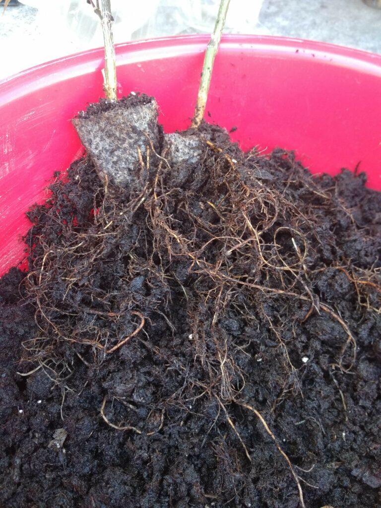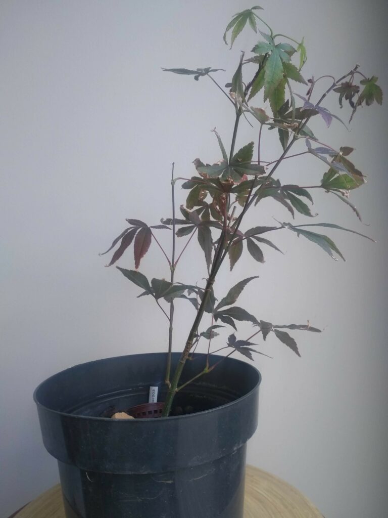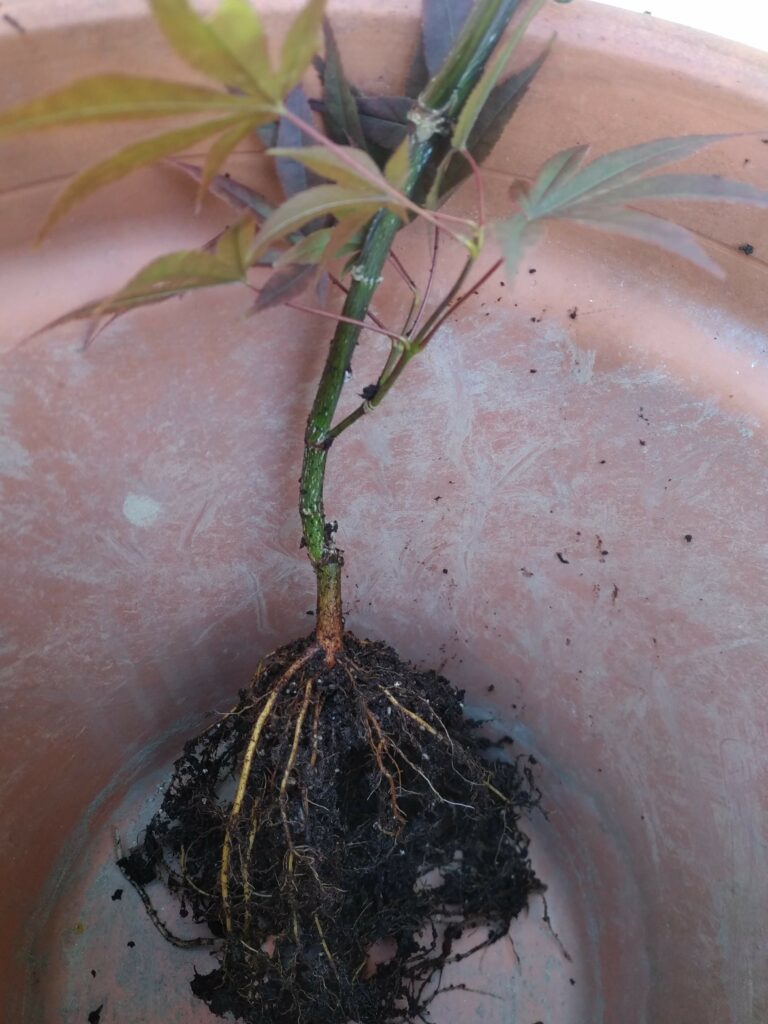 Même package que Acer palmatum #2 : il y avait deux plants dans le même pot (même s’il a fallu tirer sur le racinaire pour les séparer). Celui-ci est très rectiligne.