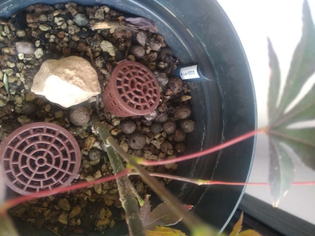 Comme pour Acer palmatum #2, l’essentiel du substrat d’origine est éliminé (j’en garde un peu pour limiter le stress vu la saison avancée). Sauf erreur, on est sur une tige marcottée, donc pas de trace de greffe, ce qui est plutôt une bonne nouvelle. Substrat minéral drainant classique : 40% pumice, 40% zéolithe, 20% terreau d’origine.