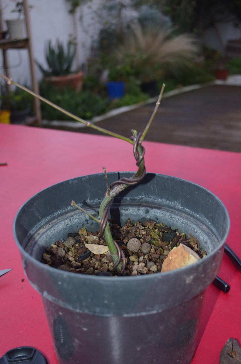 Pour tenter de donner un peu de mouvement à cet arbre, une ligature est posée le 19 décembre 2021. Elle restera en place tout l’hiver, lorsque l’arbre est au ralenti. Les prochaines fois il faudra essayer de s’y prendre un peu plus tôt, en automne, lorsque l’arbre est en pleine production de bois et de réserves.