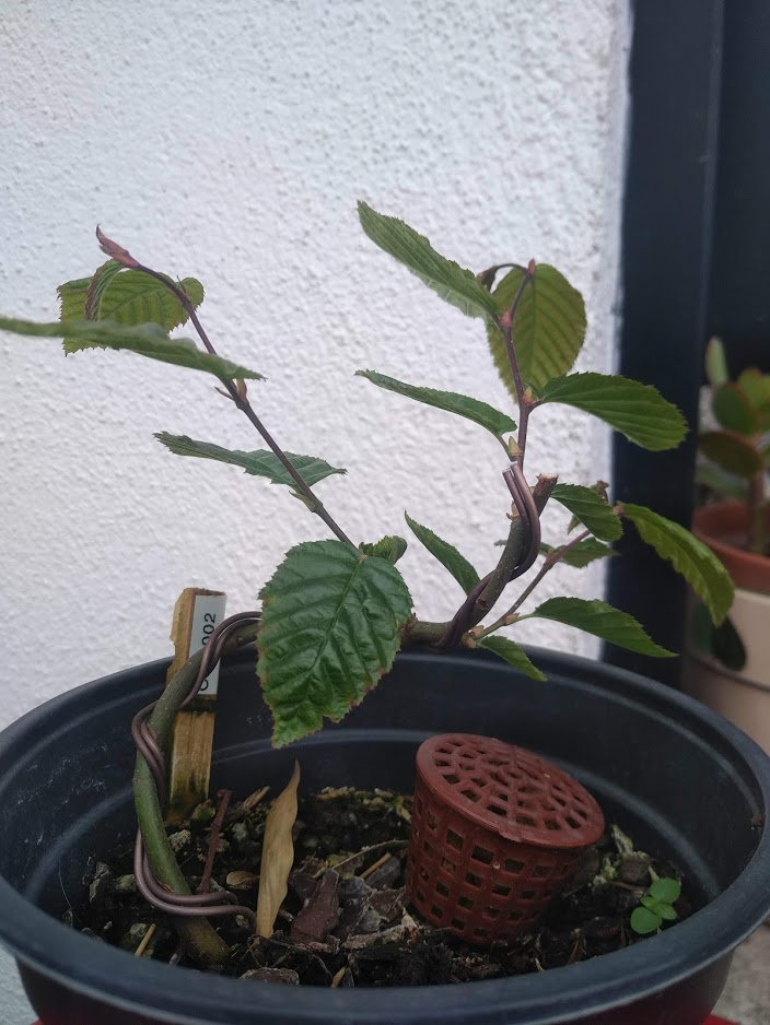 Octobre 2020 : acquisition d’une bouture de Charme commun (charmille) de pépinière. Dans un premier temps je laisse pousser dans son godet d’origine.