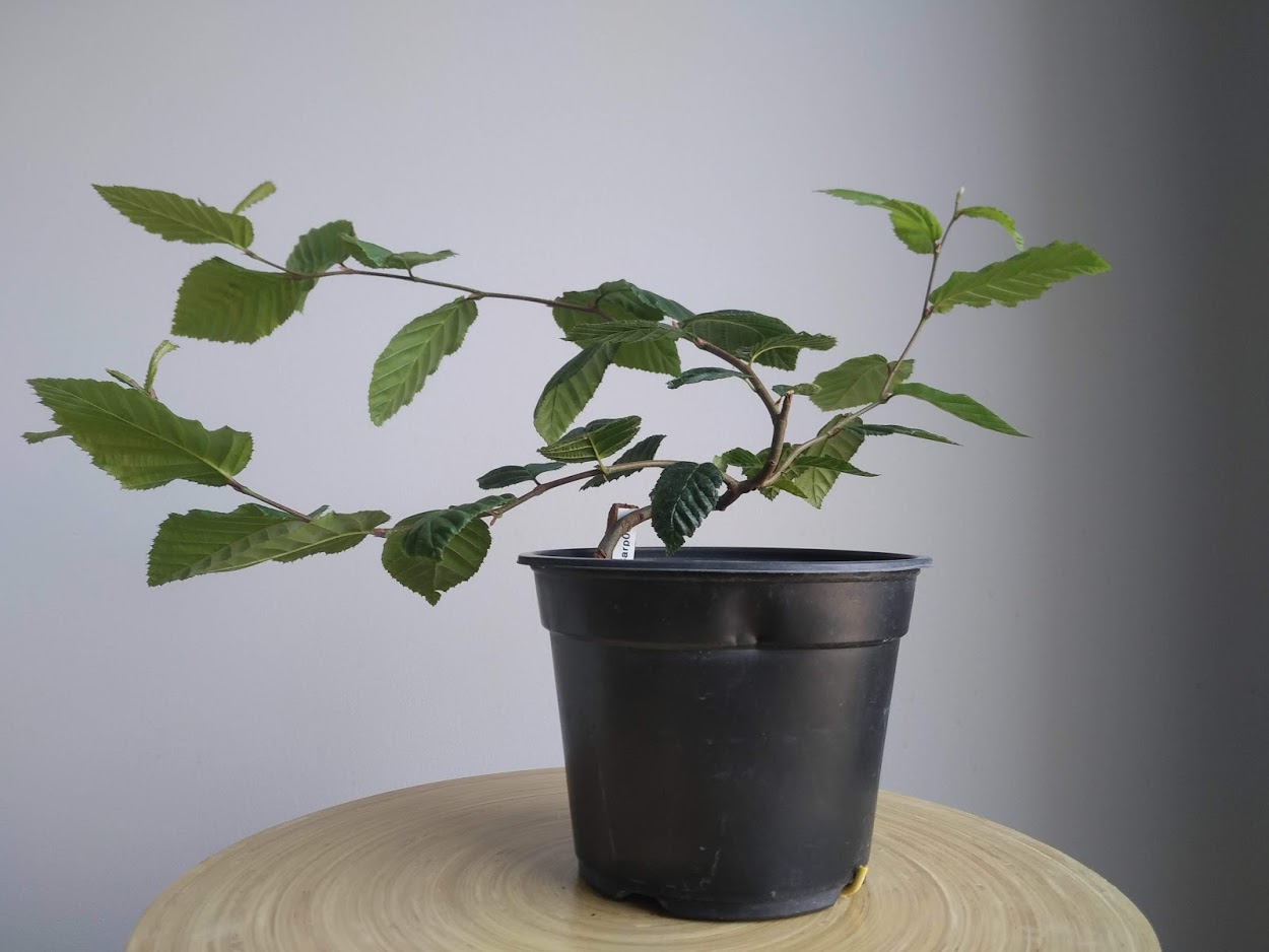 Je réduis les longueurs de ce Charme commun en formation. Même s’il n’est pas encore assez gros et que le laisser tiger pourrait être une meilleure idée. Le mouvement initial est finalement intéressant et laisser déjà penser de pouvoir en faire un shohin digne d’intérêt…