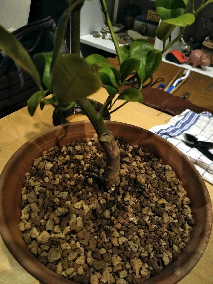 Pour diversifier les espèces de Citrus que j’apprécie par dessous tout pour leur parfum, je décide d’ajouter un Calamondin à ma collection. Ce jeune plant de pépinière est clairement issu d’une bouture, avec les défaut attendus et que le rempotage me confirme : le système racinaire s’est formé sur plusieurs niveaux. Au passage, la motte de terreau d’origine est très humifère, pas compacte mais détrempée, cela explique pourquoi le système racinaire est très peu développé. L’enjeu après ce rempotage sera de bien cultiver l’arbre pour espérer améliorer le pain racinaire.