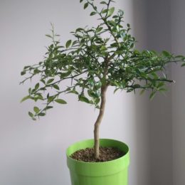 Trouvé en grande surface, un citron caviar en pot, pas trop vilain. L’arbre fait une quarantaine de cm de haut. Rempotage immédiat…