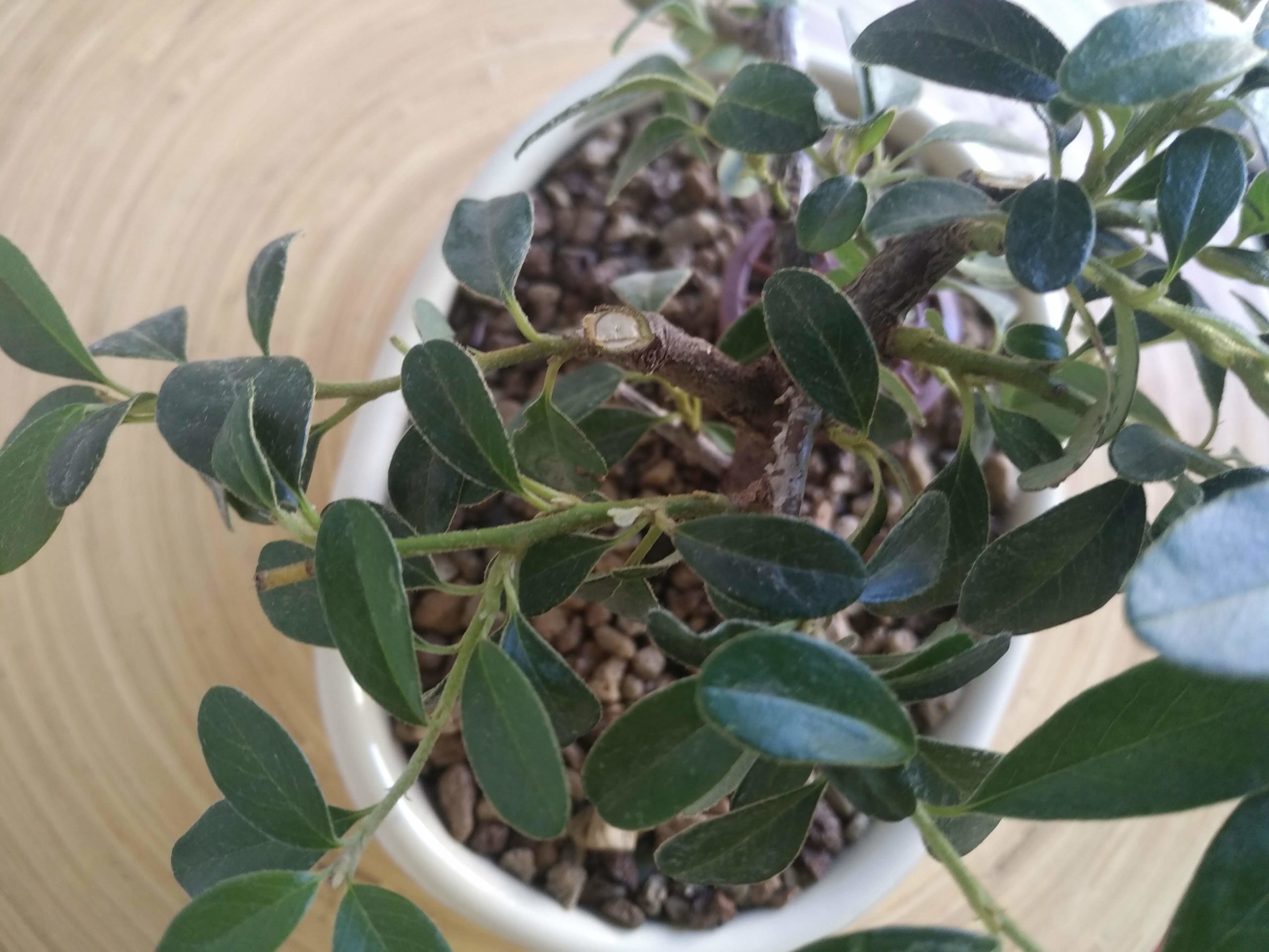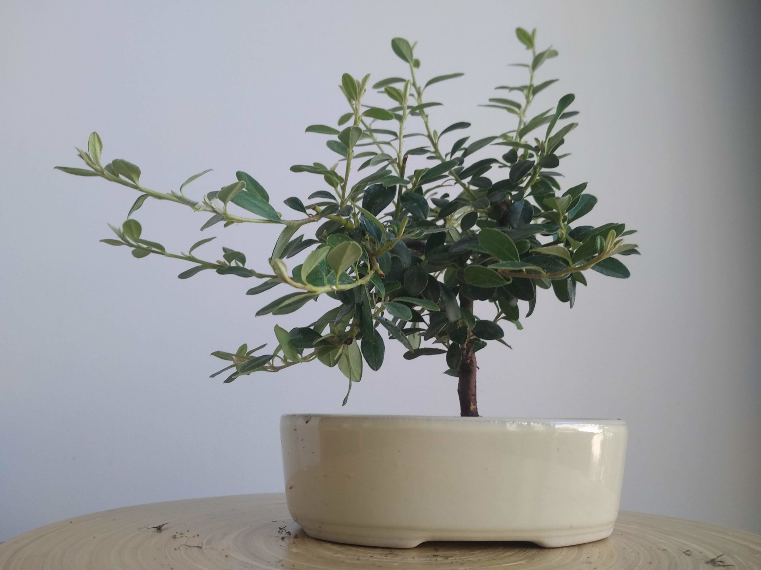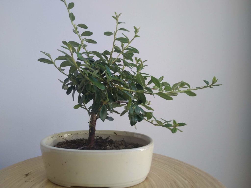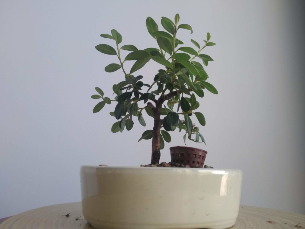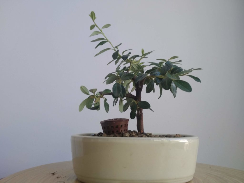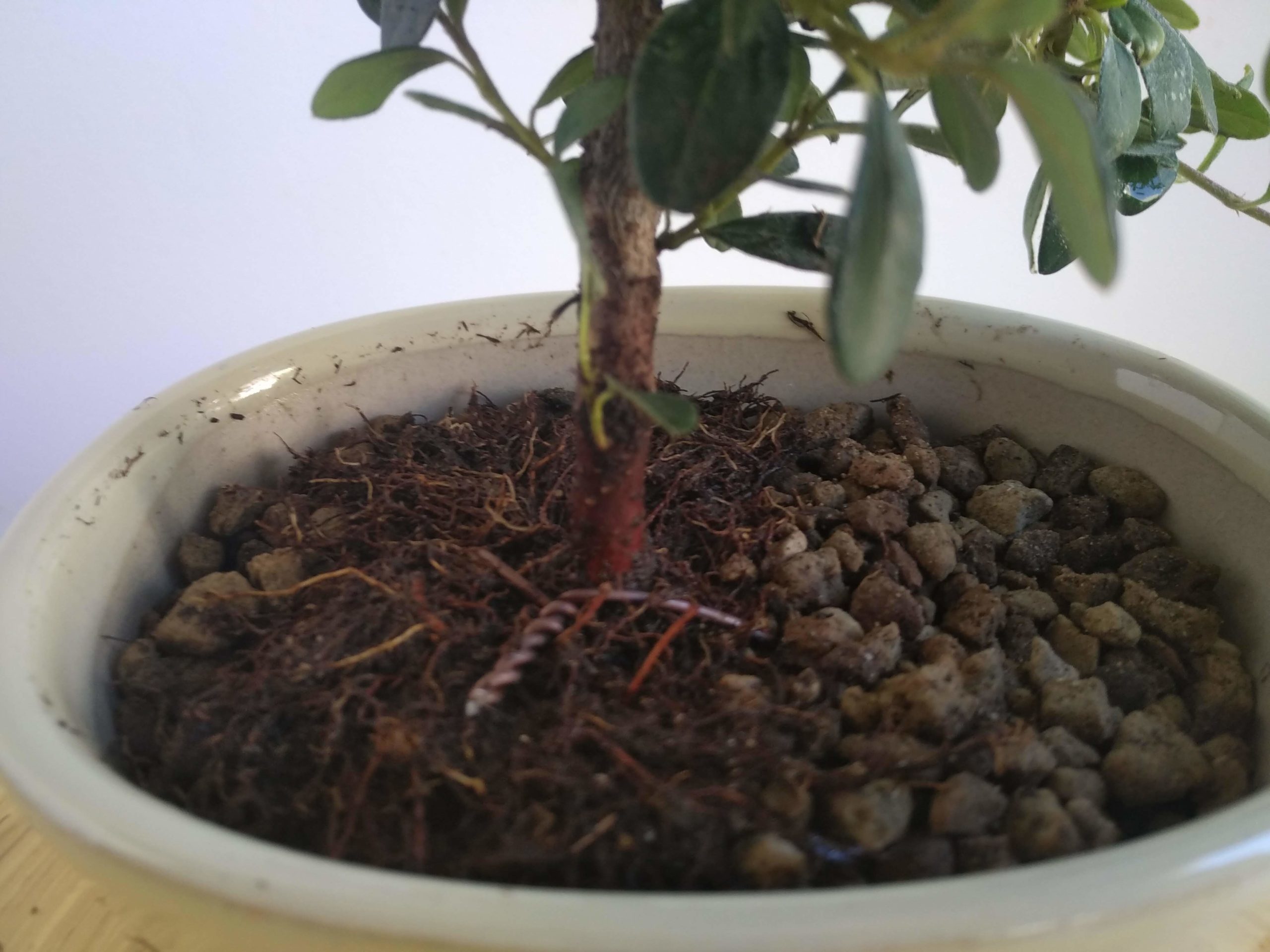 Rempotage dans un pot plus élégant que les godets de culture. Le substrat est un mélange de pumice (50%), zéolithe (40%) et terreau (10%). L’arbre est fixé par un fil de ligature et le racinaire nettoyé est positionné bien à plat et en étoile.
