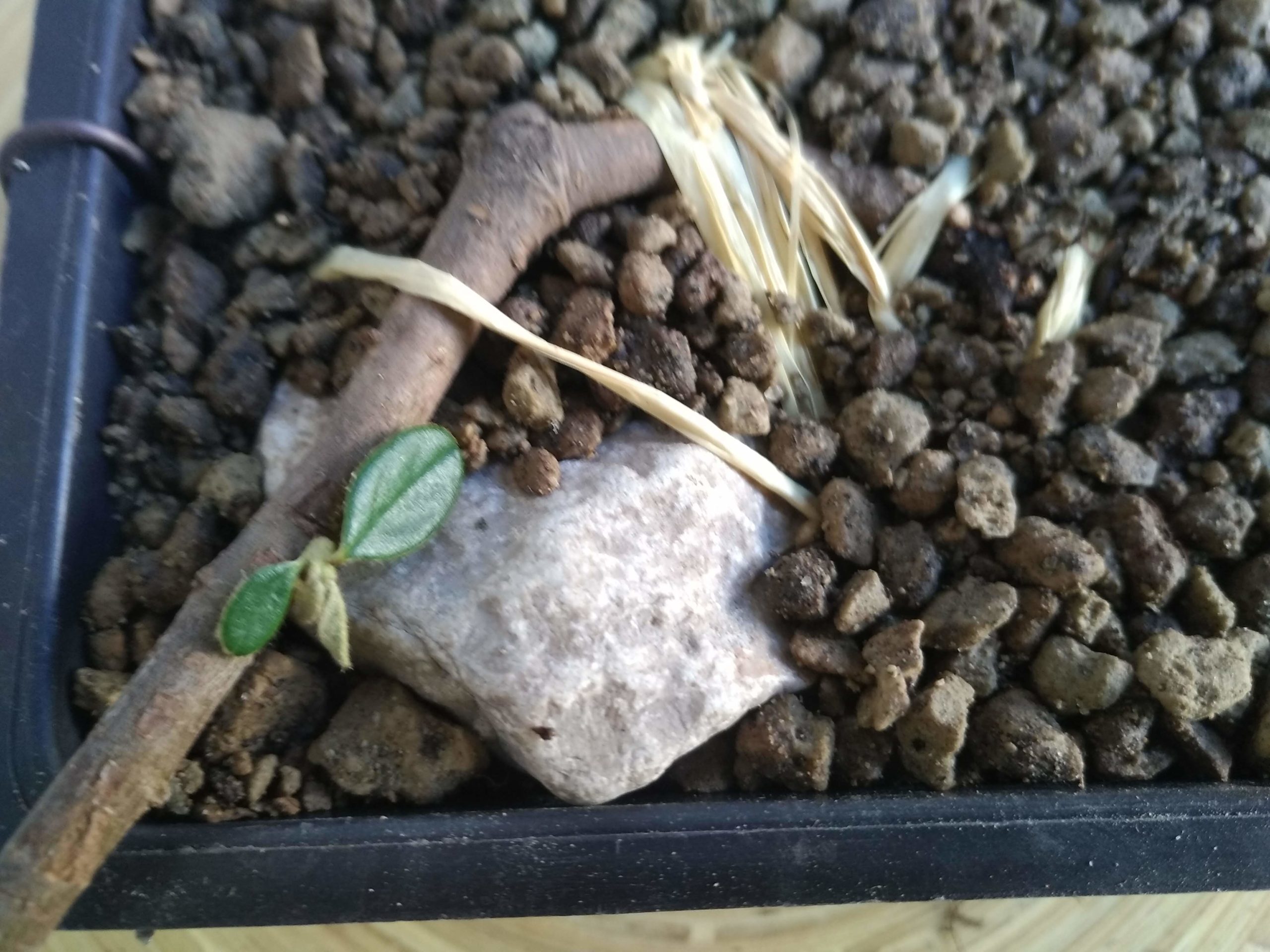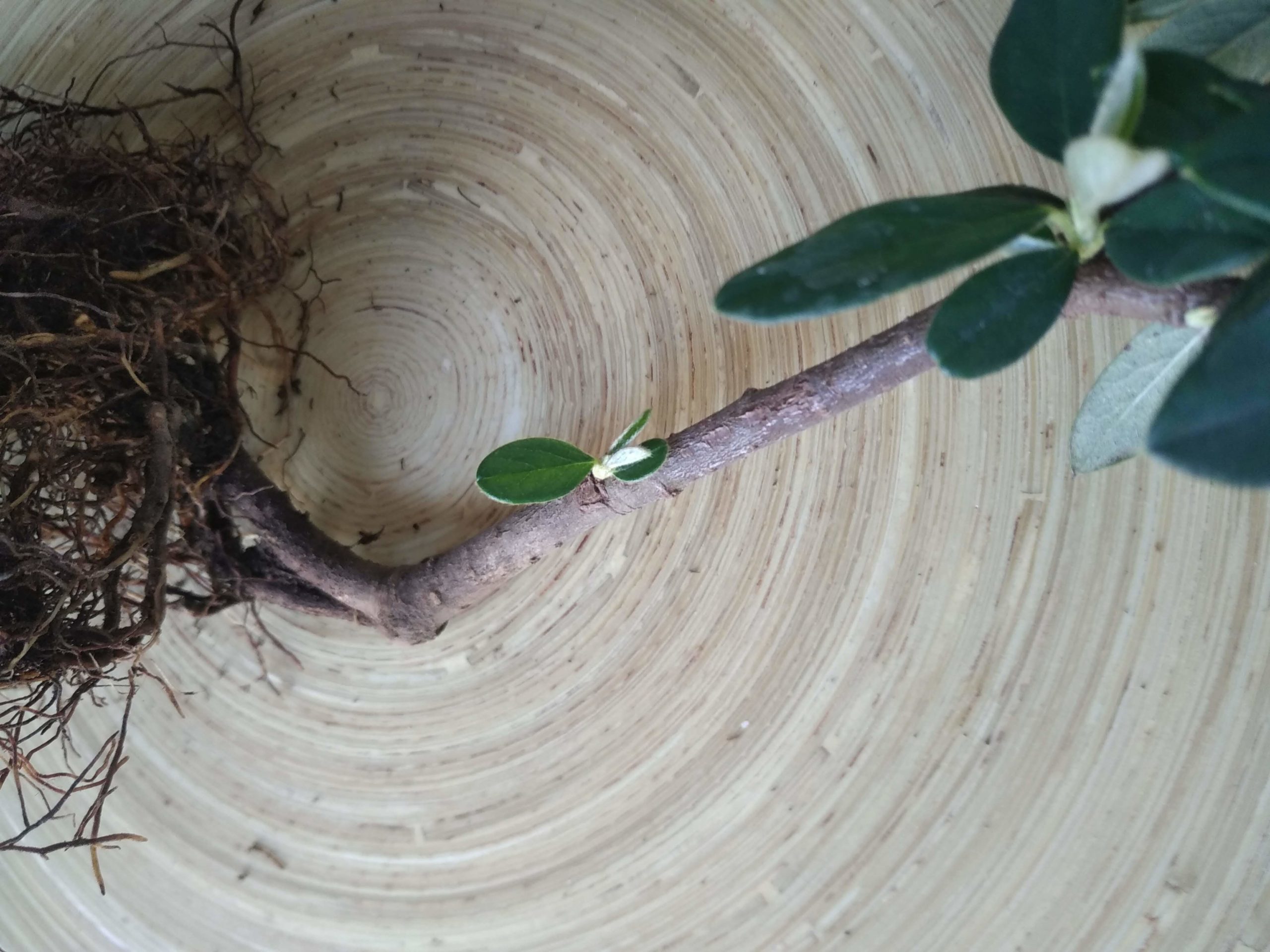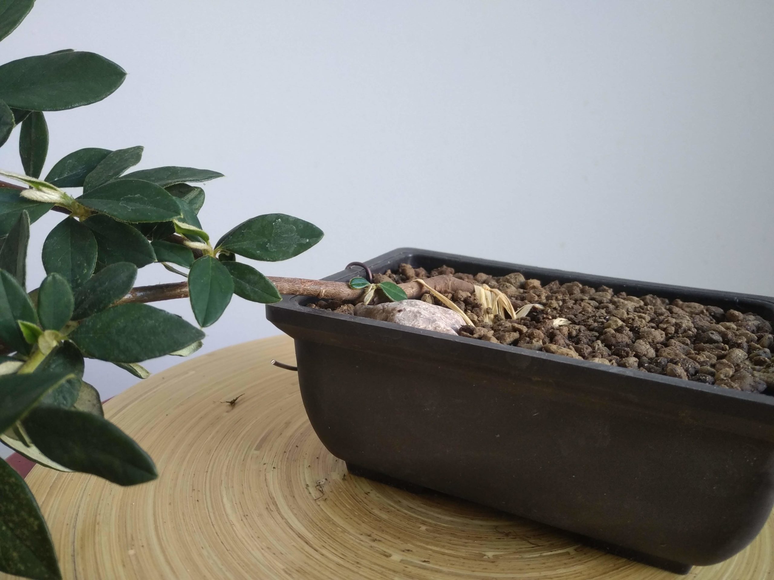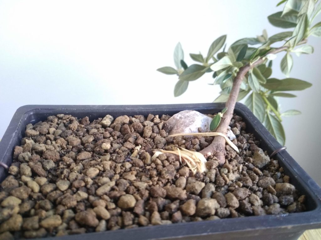 Pour tenter de contourner le problème je tente un montage sur une pierre (style Sekijojû) en espérant voir apparaitre une forme plus sympa, quitte à changer plus tard l’orientation de l’ensemble. Les racines sont plaquées le long de la pierre à l’aide de fils de raphia. D’ici deux ans j’espère que la pierre sera bien intégrée au racinaire et qu’un mouvement se dégagera. En attendant on limitera fortement les interventions pour laisser la plante travailler.