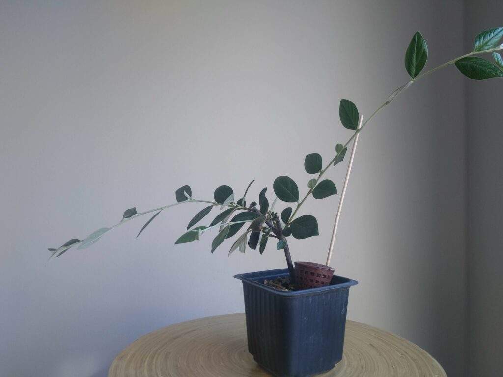 Cotoneaster franchetii, de pépinière, acquis en avril 2021. Transpotage dans le même godet, avec un substrat de recyclage plus drainant. Une partie du terreau d’origine est conservée.