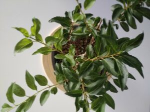 J’élimine d’abord au moins 2/3 des longueurs pour pouvoir manipuler correctement la plante et la rempoter dans un substrat drainant. Je préfère garder 10 à 20% de terreau mélangé au substrat pour éviter le stress d’un changement trop brutal des conditions de culture et voir si le Forsythia accepte d’être à l’étroit.