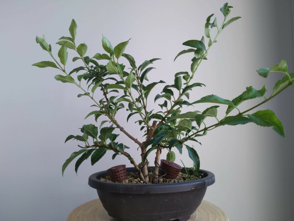 Forsythia est un genre peu documenté en bonsaï. Je verrai comment réagit l’arbre. Comme souvent avec les essences à floraison précoce, les tailles devront être limitées en fin de saison si on espère profiter des fleurs au sortir de l’hiver. Autre inconnue : l’arbre va t-il grossir ? Après tout, je ne connais dans la nature que des specimens volontairement rabattus sur souche tous les deux ou trois ans, ce qui fait buissonner la plante à défaut de grossir.