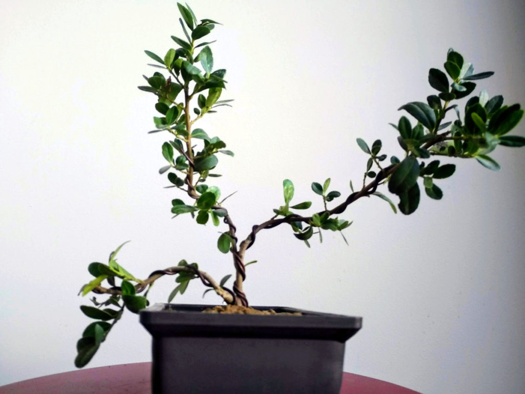 Pose de ligature pour rompre ce port dressé pas très élégant. Je me limite à quelques vagues mouvements, en attendant une nouvelle pousse et une intervention plus formelle. A noter une branche cassée (la première 🙁 ) par un mouvement trop appuyé.