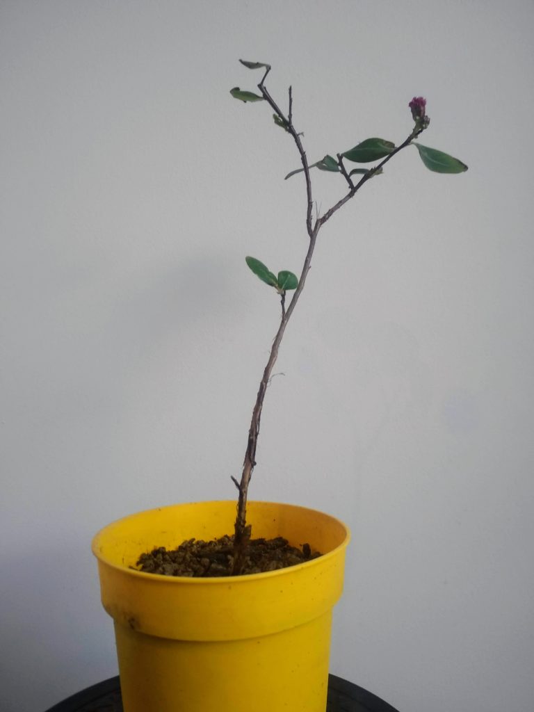 L’arbre reste à la mi-ombre le temps de la reconstruction racinaire. Pour l’instant l’allure de cette bouture est peu flatteuse. Il faudra certainement du temps avant d’obtenir quelques chose de présentable. Priorité à venir : une bonne culture pour faire grossir le tronc.