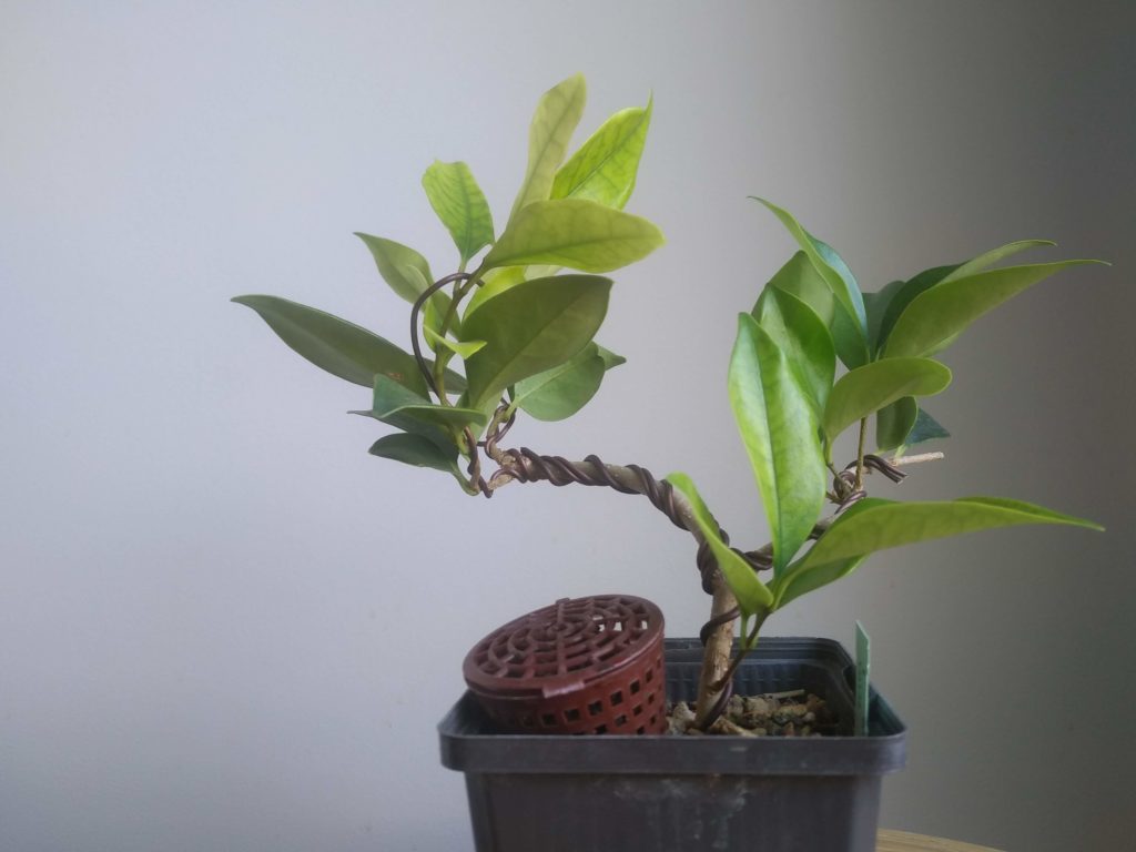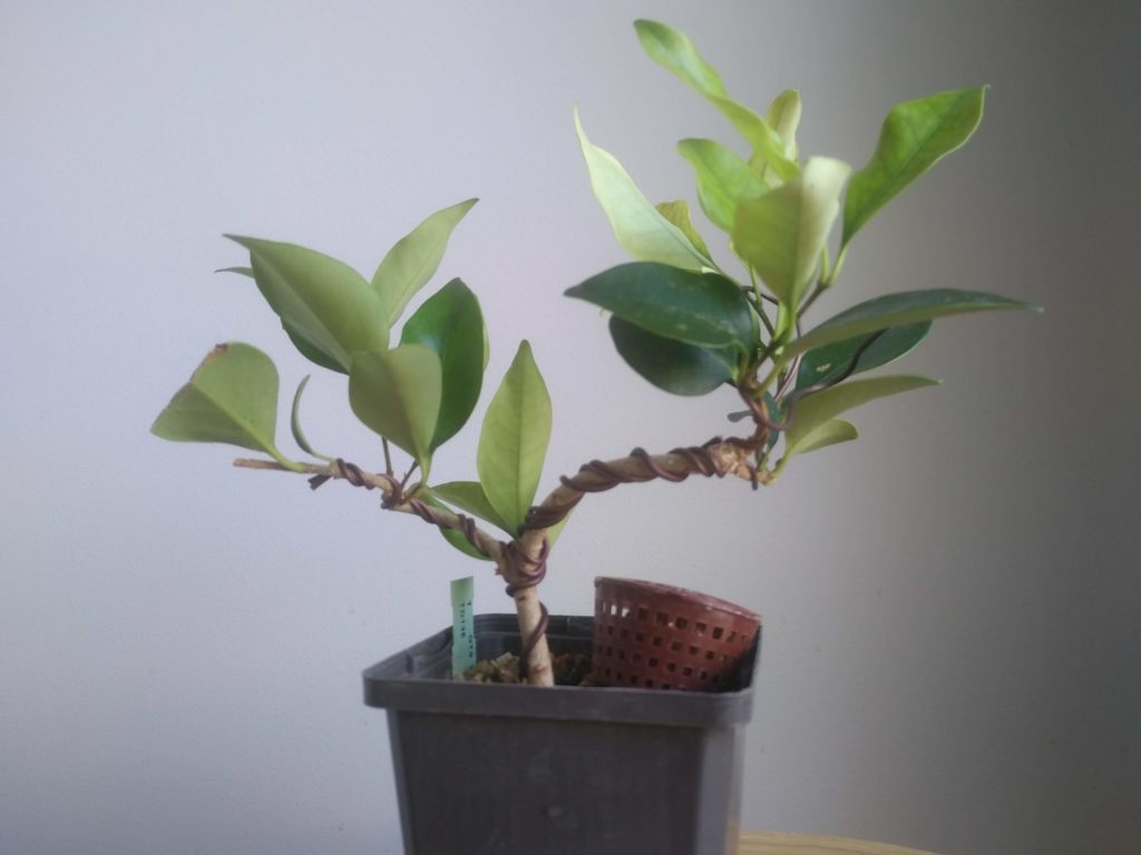 Avril 2021 : Troène du Japon en godet. Le pied est sain, avec un développement racinaire correct, dans un substrat de type terreau humique. Après un léger nettoyage, on replante dans un mélange drainant (50% pumice, 40% zéolite, et 10% du terreau d’origine).