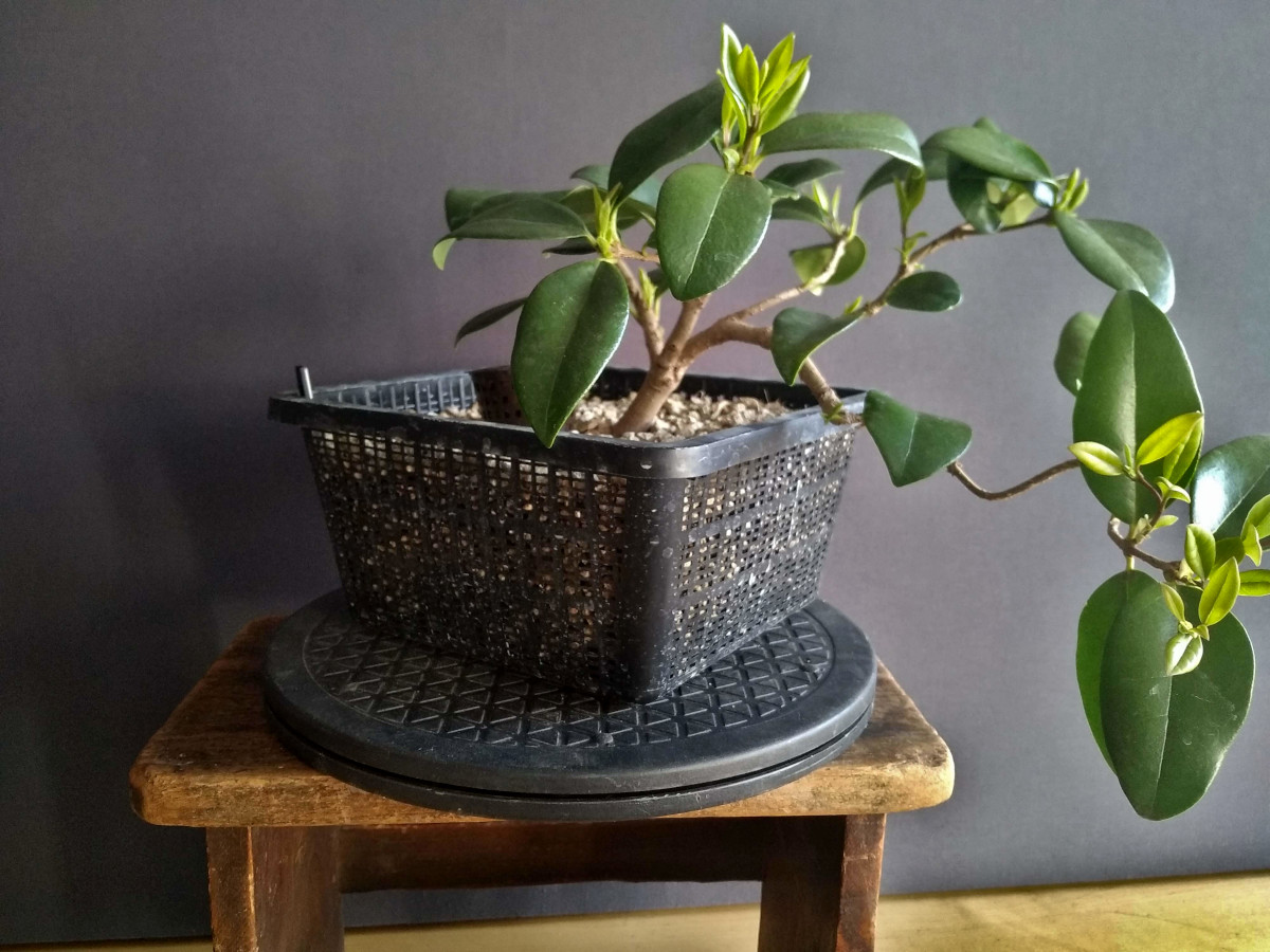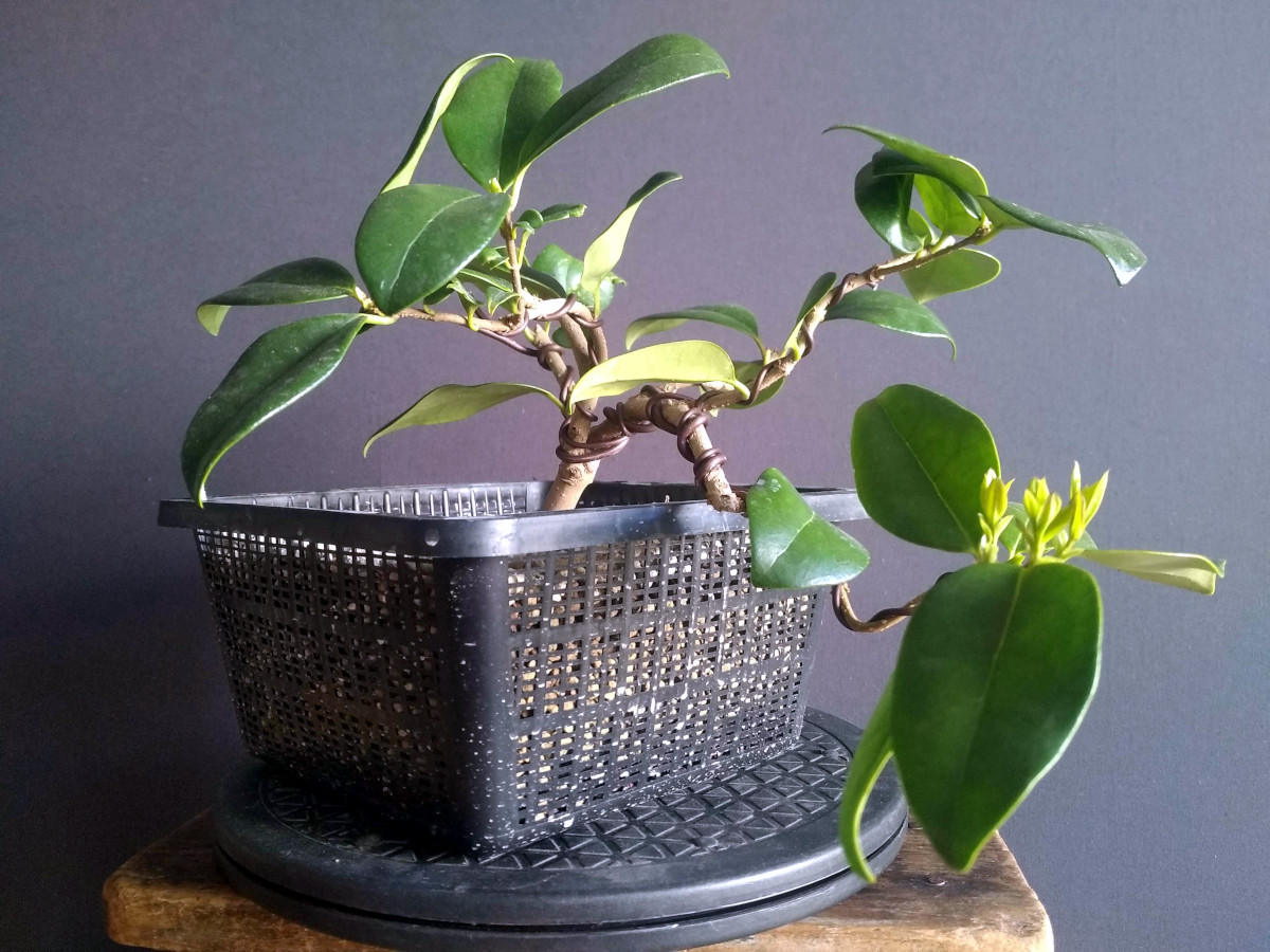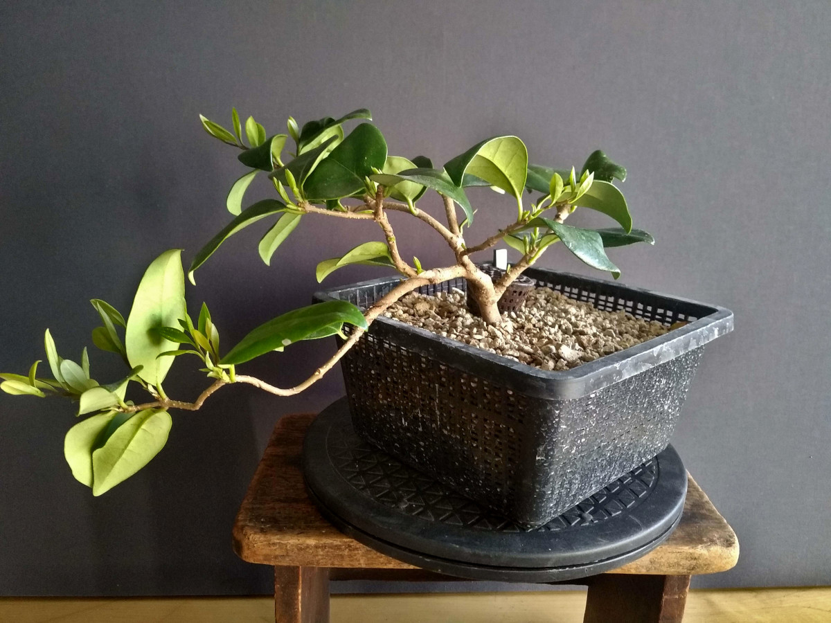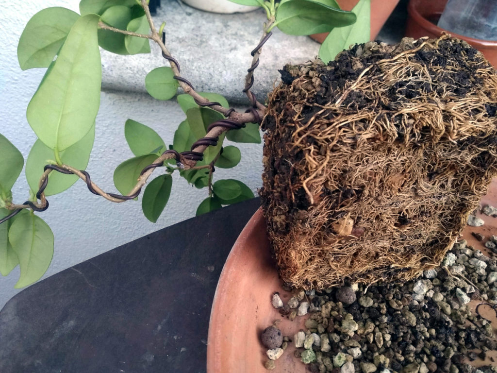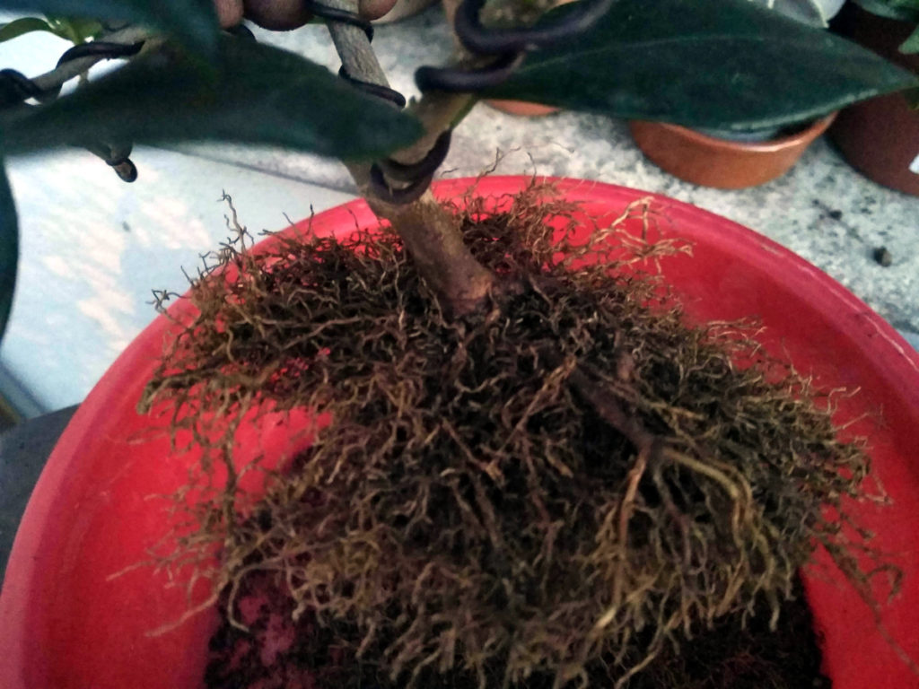 Le substrat utilisé reste classique : un fond très drainant (pumice et pouzzolane de grosse granulométrie), puis un mélange pour moitié de pumice et de zéolithe chabasite. L’arbre a bien entendu été fixé au pot à l’aide de fil de ligature, et sera remis en culture à mi-ombre.