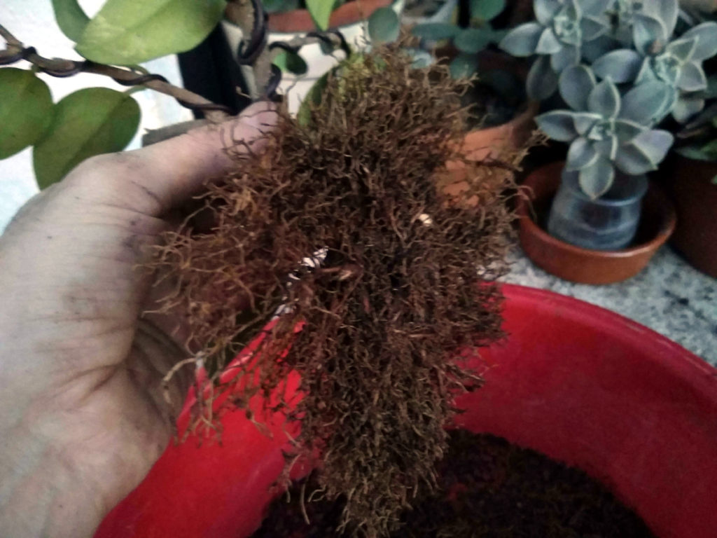 Le racinaire est bien développé, ce qui confirme l’intérêt d’utiliser des substrats minéraux, texturés et drainants. Le cœur du racinaire est un peu dense (une partie du substrat d’origine avait été conservé) et nettoyé avec une baguette en bois. Le résultat général est plutôt intéressant et monter que la plante est en bonne santé. J’en profite donc pour éliminer quelques portions de tubes et dégager le dessous de la motte.