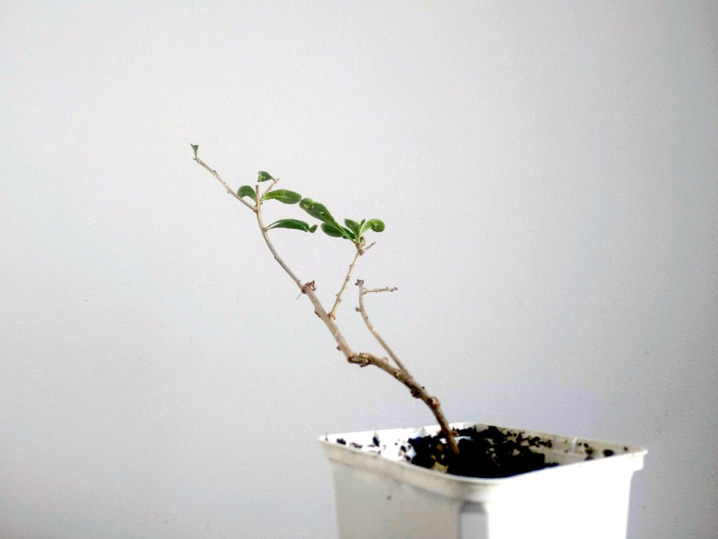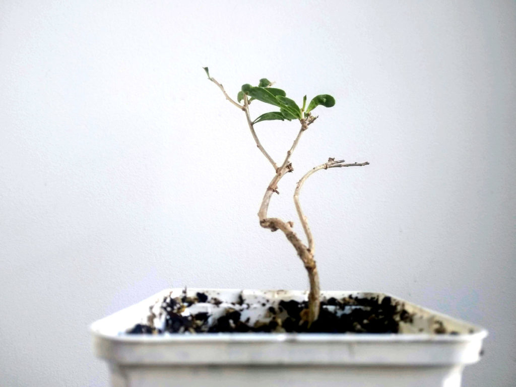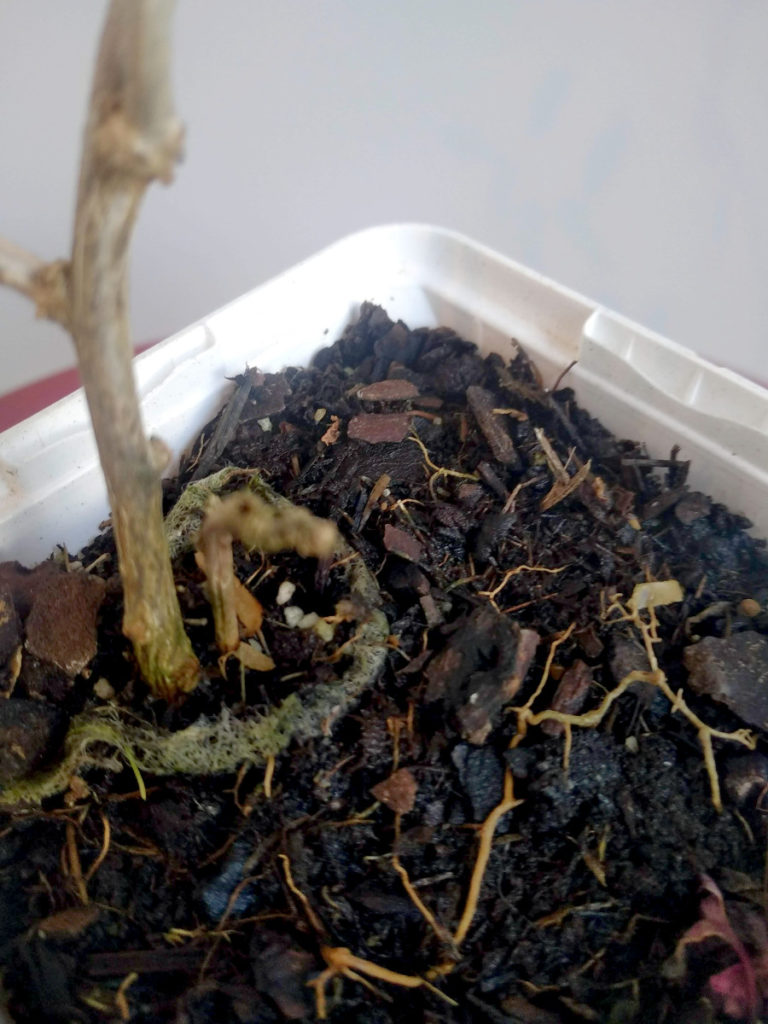 Jeune bouture de Goji en godet, dans un substrat spongieux, avec le feutre de bouturage (ou de marcotte ?) encore visible. Le chevelu racinaire est fragile, très long et « chignolé » trop bas.