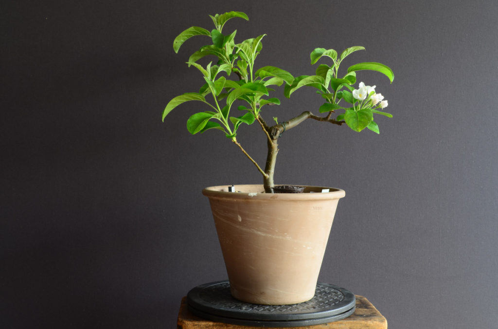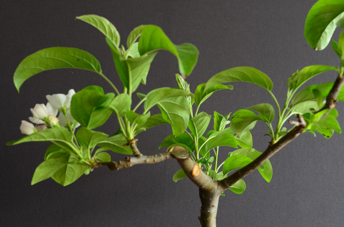 Bilan après un an de culture : ce pommier, issus d’une bouture de pépinière, a bien réagit aux conditions de culture, au rempotage et à la taille. Après une saison complète, il repart à la même période que l’an passé, avec une feuillaison et une floraison similaires.