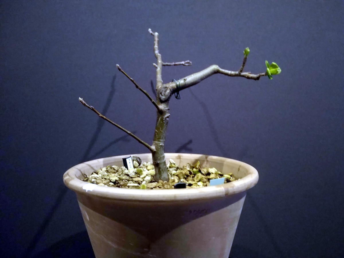 La forme de l’arbre est un peu difficile à déterminer : la première branche est vraiment très grosse par rapport au reste, et les nouvelles pousses sont toutes très verticales. Pour l’instant je pars du principe que la ligne de tronc suivra cette branche et je laisse partir la pousse verticale qui la prolonge.