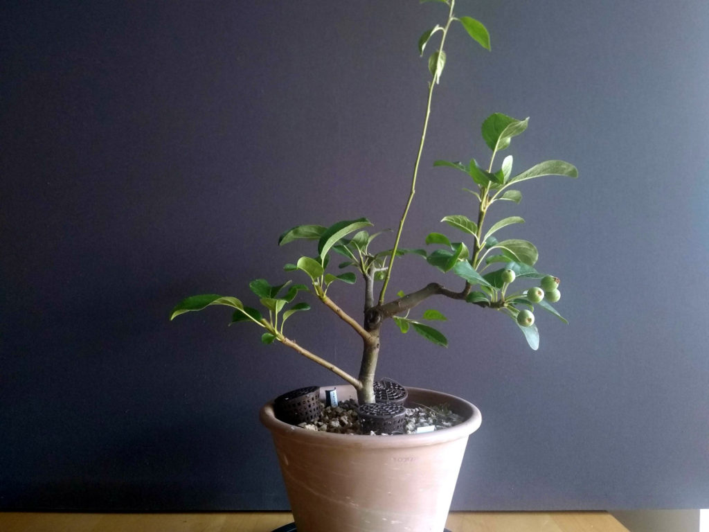 La forme de l’arbre est un peu difficile à déterminer : la première branche est vraiment très grosse par rapport au reste, et les nouvelles pousses sont toutes très verticales. Pour l’instant je pars du principe que la ligne de tronc suivra cette branche et je laisse partir la pousse verticale qui la prolonge.