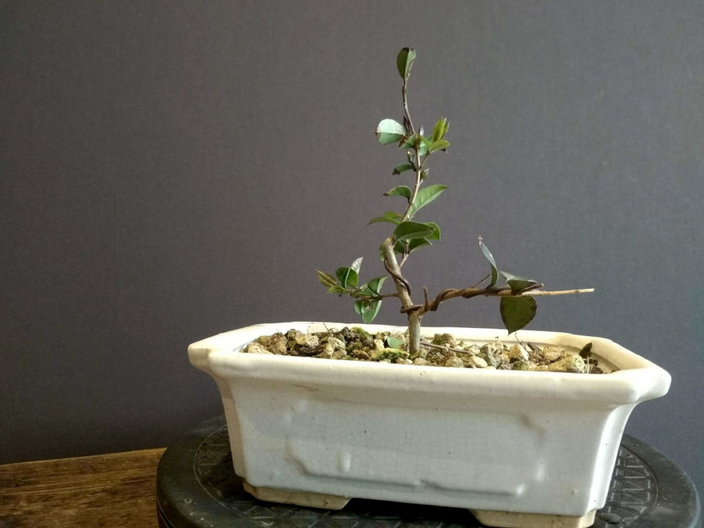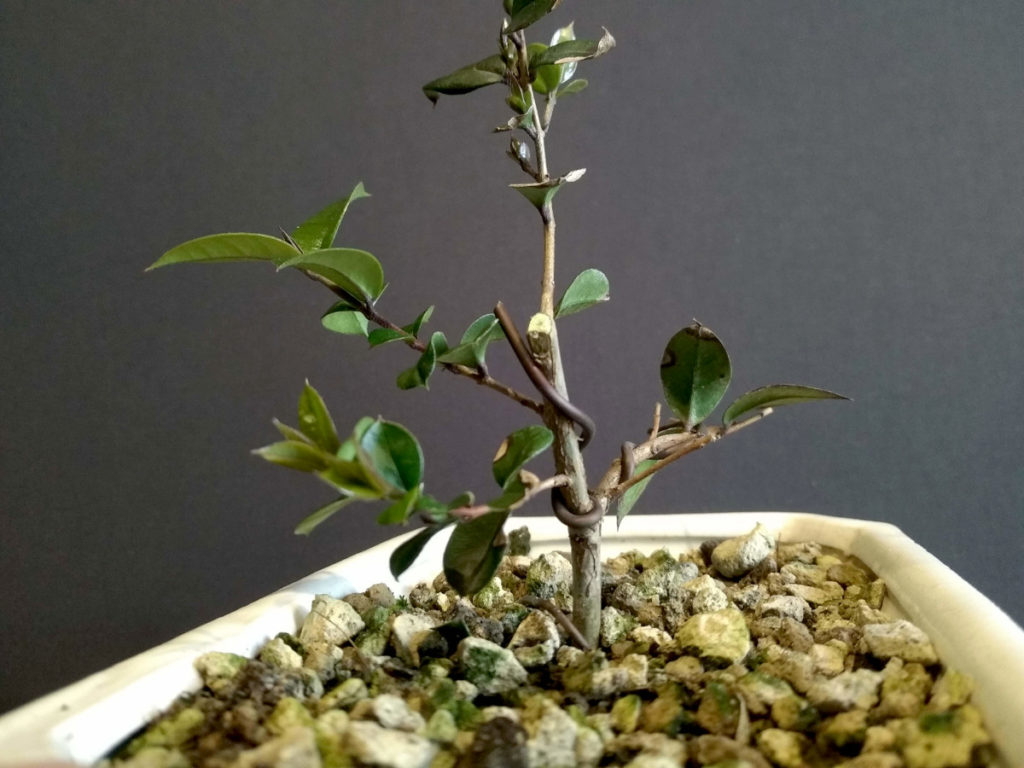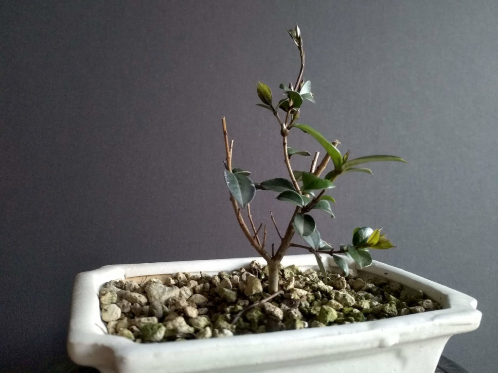 Les premières feuilles de l’année pointent déjà à la mi-février. Constatant que le substrat est encore correct, je me limite à retirer les brindilles sèches et avec une légère ligature, à diriger les branches que je décide de conserver.