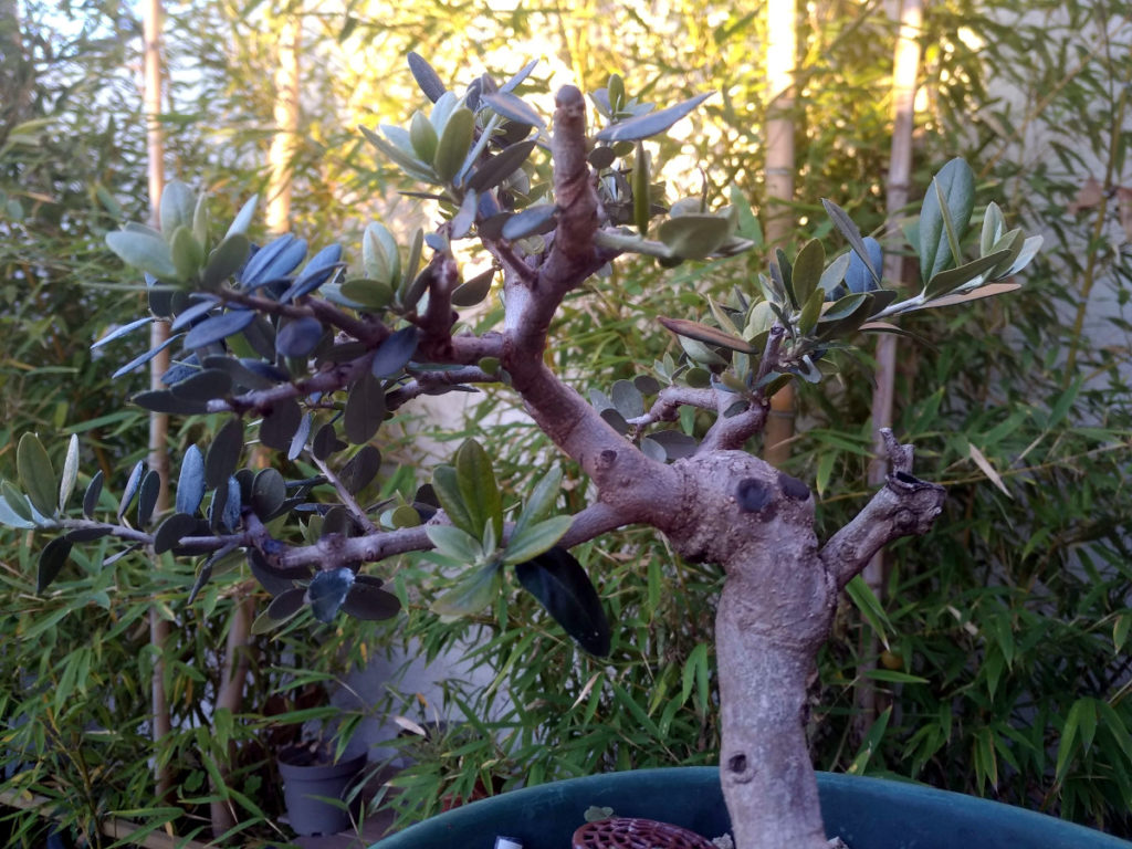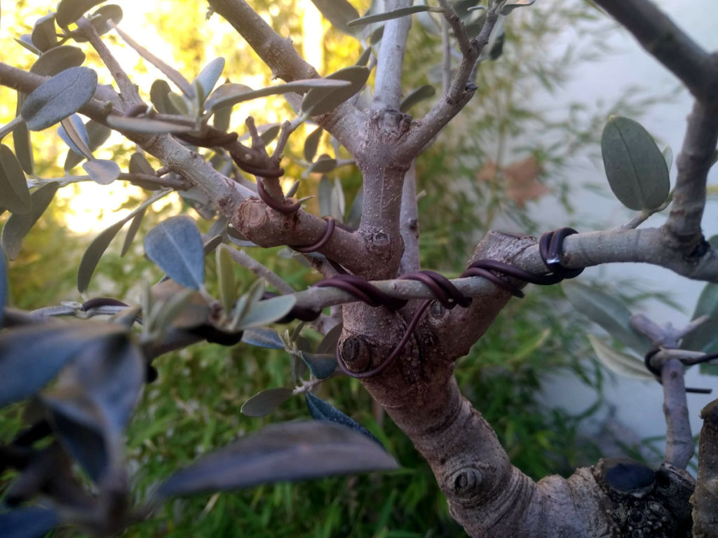 Début de l’hiver, les températures commencent à tomber la nuit. Pour autant quelques arbres continuent et vont continuer à pousser. Par précaution je retire donc la ligature des oliviers, qui est posée depuis quelques temps, avant qu’elle ne marque l’écorce.