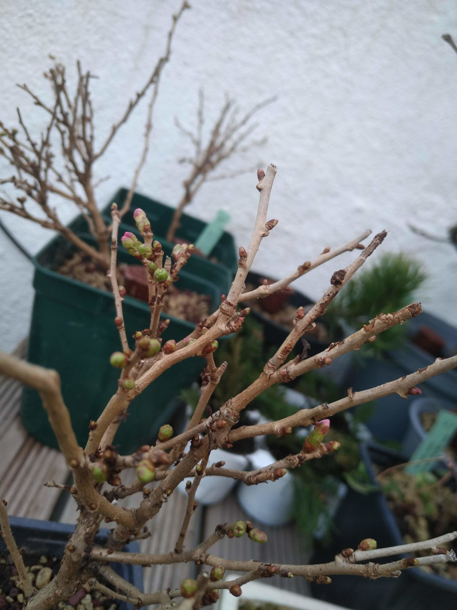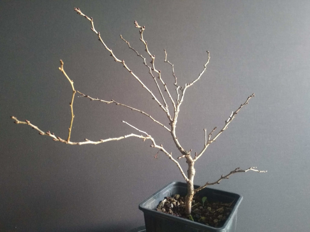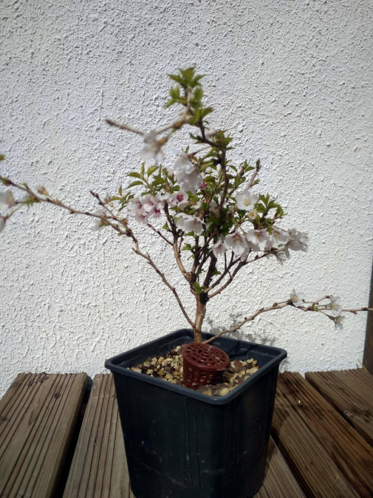 Troisième exemplaire de Prunus incisa Kojo No Mai. Ce cultivar nain et naturellement tortueux se prête bien à la culture en pot. Un premier transpotage a été effectué en février 2021. Il nécessitera peut être un vrai rempotage au printemps 2022, en fonction des conditions de culture.