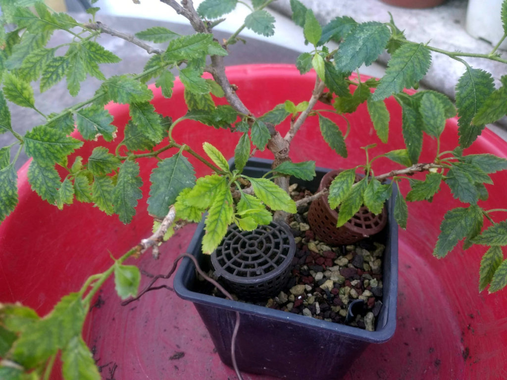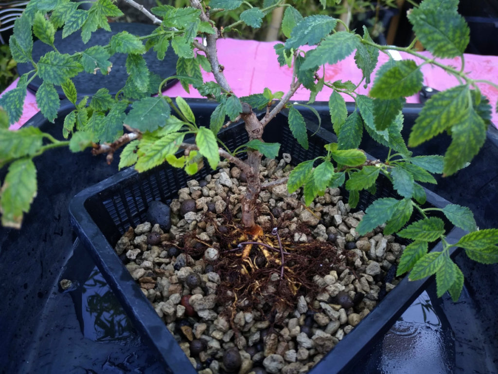 Bref, ce matin j’ai décidé de vérifier les racines. Et bien m’en a pris : le substrat est colmaté. Pourtant j’avais mis une couche drainante de grosse granulométrie, et une large part de pumice. Malgré tout, en sortant l’arbre de son pot je constate que les grains du tiers inférieur sont collés par une boue rouge. C’est un comble pour une couche censée assurer le drainage.